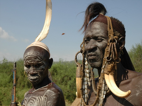 Przed nami Etiopia i choć to kraj, posiadający własny, unikatowy język amaric, tutaj też w prostej, codziennej komunikacji posługujemy się z powodzeniem angielskim. Nawet w najmniejszej, z pozoru ukrytej przed światem wiosce zawsze znajdzie się jakiś wyrostek, który z daleka krzyczy "Hello, how are you?" Szybko jeden wyrostek zamienia się w pokaźną grupkę wyrostków, pretendujących do bycia naszym osobistym przewodnikiem. Ciężko tu o demokratyczny sposób wyboru najlepszego kandydata, więc wzniecając tumany kurzu ciągnie się za nami cała plejada różnego wzrostu i ubrania przewodników. Etiopskie dzieci, objęte obowiązkiem szkolnym uczą się angielskiego, więc szybko wywiązuje się rozmowa. Chętnie opowiadają o okolicy, w której żyją, choć ich ulubionym zwrotem jest "one dollar". Zamiast dolara sprawiamy im prawdziwą futbolową piłkę i teraz razem z Piotrem pół wioski ugania się za nią po boisku, urządzonym wprost na prowizorycznym pasie startowym. Tuż obok trawę skubią krowy i osły. Etiopia to dla przybywającego podróżnika przede wszystkim Dolina Omo, gdzie można spotkać pierwotne ludy Mursi, Hamer, Erbore i inne. Tutaj znów niezbędne jest towarzystwo lokalnego przewodnika, który nie tylko zna angielski, ale przede wszystkim język plemienny klanu, do którego się akurat wybieramy. To on w naszym imieniu uzgadnia z wodzem wysokość "opłaty wjazdowej" do ich koczowniczej wioski i czas, jaki możemy w ich towarzystwie spędzić. To ostatnie miejsca w Afryce, gdzie mieszkający w zbudowanych na prędce szałasach pierwotni ludzie w opaskach na biodrach i z niezliczoną ilością oryginalnych ozdób w różnych częściach ciała nie ulegli jeszcze totalnej komercjalizacji i nie robią specjalnych pokazów dla turystów. Przedstawiciele plemienia Mursi witają nas z naładowanymi kałasznikowami na gołych plecach. Nie sprzeciwiamy się i dokładamy jeszcze banknoty do kupki, którą dzierży wódz i kręci z niezadowoleniem głową. Nie liczy się wartość kupki wymiętych etiopskich pieniędzy, a jej objętość. Teraz droga wolna. Nasz kilkunastoletni przewodnik ustala teraz warunki fotografowania i razem z wodzem wybiera co bardziej okazałe "modelki". Kobiety z nagimi piersiami i ogromnymi glinianymi krążkami w dolnych wargach zamiast ustawiać się do zdjęć otaczają mnie ciasnym kręgiem i w najlepsze nabijają się z mojego nosa i piegów. Któraś nawet próbuje zeskrobać je z moich ramion.